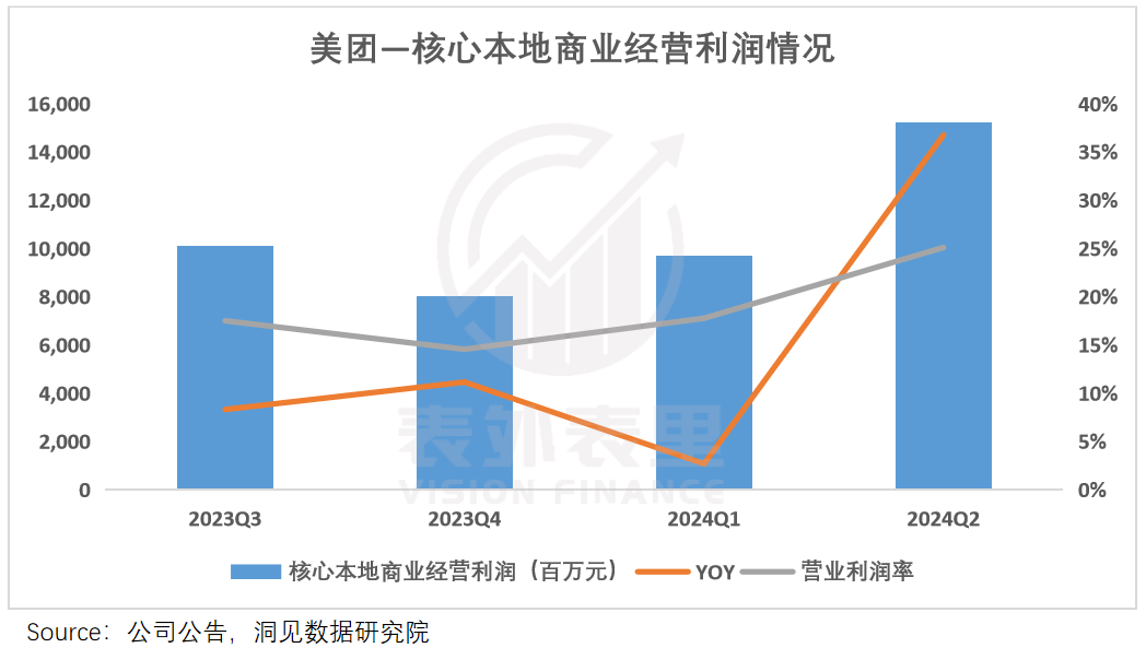 美团2024Q2财报显示,核心本地商业分部的收入同比增长18.5%,其中经营利润大增36.8%至152亿元,利润率提升至25.1%。