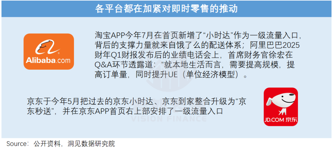 争抢高地的原因是,即时零售正跳出之前购买鲜花、药品等应急场景,向日常场景延伸,没人想被落下。