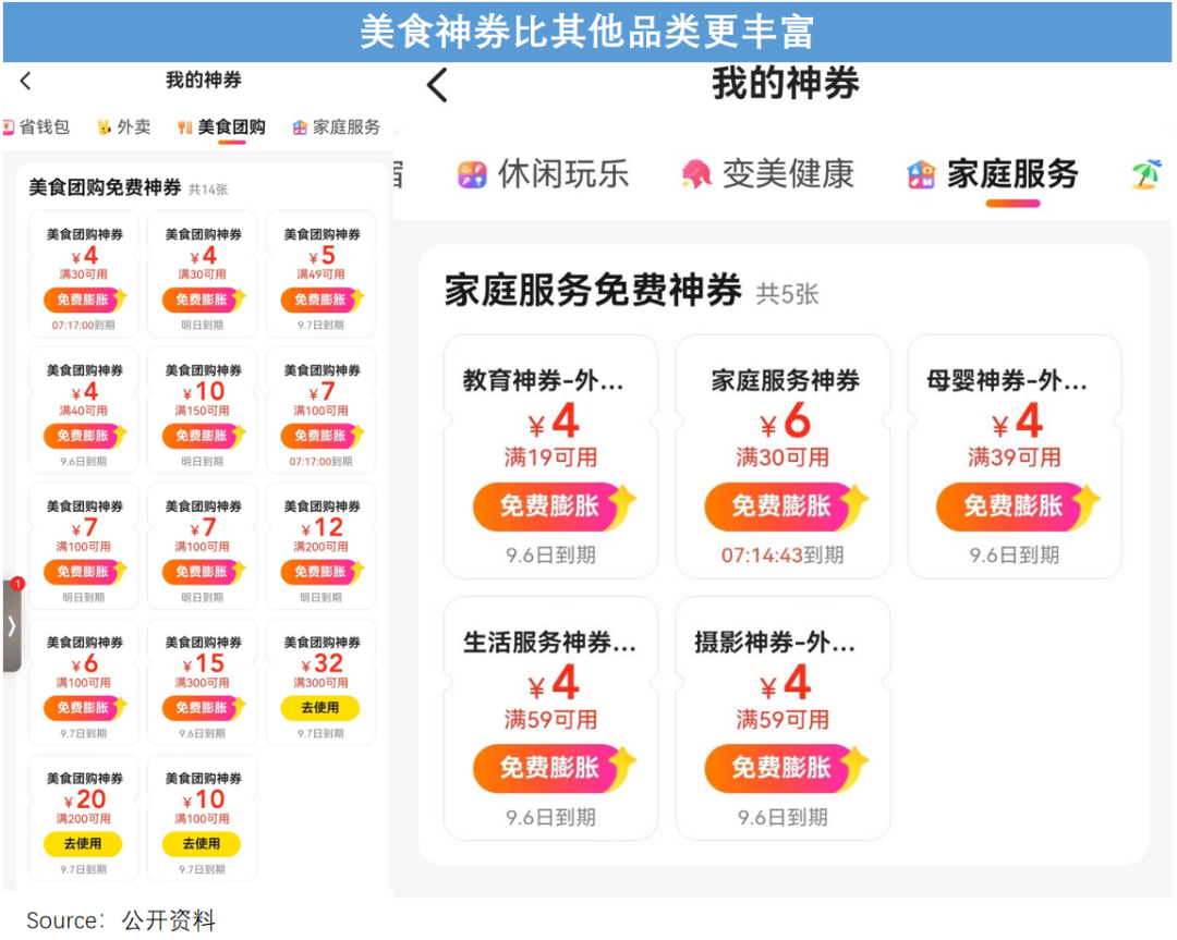 且不同场景的券还暗藏“玄机”:免费神券在美食团购上数量、额度远超其他品类,毕竟到餐最容易吸引爱点外卖的吃货们。