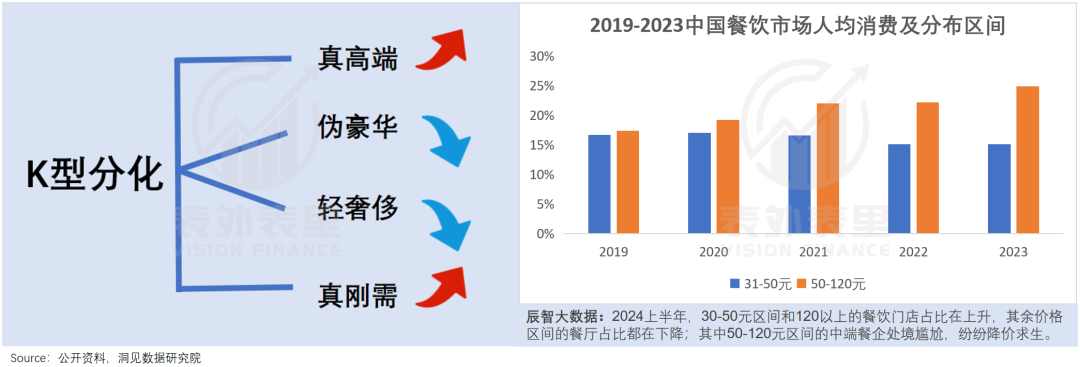 餐饮行业也是类似的情况:人均14-17元的“老年餐厅”,挤满“囊中羞涩”的打工人;人均2000+的Omakase也一座难求;50-120元区间的中端餐企,无人问津。