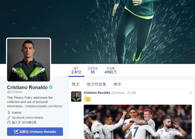 C罗的爆棚人气同样体现在社交网络上。数据追踪平台Hookit的资料显示,2016年,在Twitter、Facebook和INS三大社交网络中,C罗的粉丝数量增加了6500万,共拥有2.6亿追随者。其中,他的Facebook账号有着1.2亿粉丝数,这是全球之最。