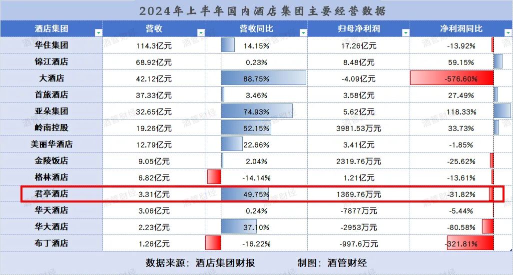 财报数据显示,2024上半年,君亭酒店实现营业收入3.31亿元,同比增长49.75%;但归属上市公司股东的净利润1369.76万元,同比下降31.8%。