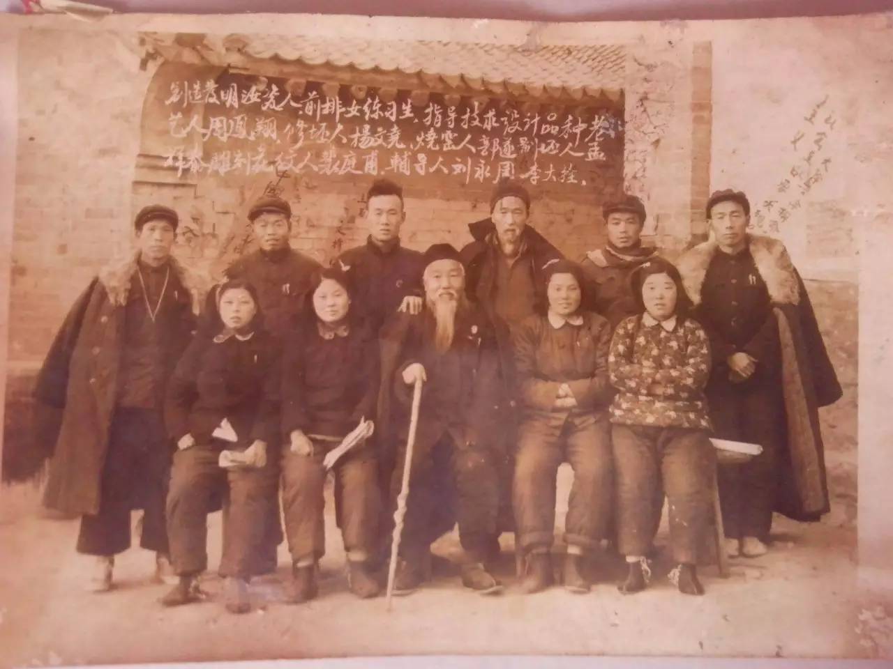 前排女练习生、指导技术设计品种老艺人周凤翔、修坯人杨文尧、烧窑人郭遂(后排从左数第三位)、刻坯人孟祥泰、雕刻花纹人裴庭甫、辅导人刘永周、李大栓。