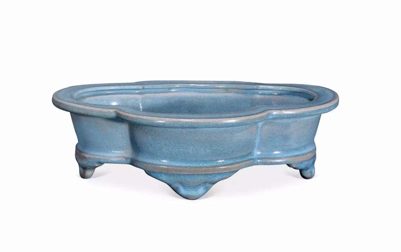 北宋汝窑天青釉葵花洗是现今唯一存世之葵花六瓣形的盆洗,直径十三点五公分,六葵瓣花式,口略撇,上丰下敛,浅腹薄壁。棱角含蓄,器身随沿起伏,圈足微外撇,底有细小芝麻钉痕三枚。是英国著名的中国古陶瓷收藏家之一艾弗瑞·克拉克夫人的旧藏,上世纪70年代转入日本收藏。