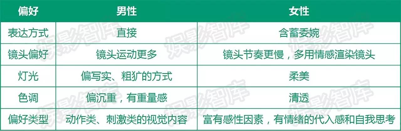 男女之间的差异同样也体现在视听语言上面。男性更喜欢偏动作、偏暴力的影片,运镜更强调动感;女性的节奏则慢一些,要将感情铺垫到位,会运用大量的情感渲染镜头。男性比较喜欢粗犷风格,打光和拍摄方式偏写实,色调上偏沉重、有重量感;女性则喜欢清透、柔美的。