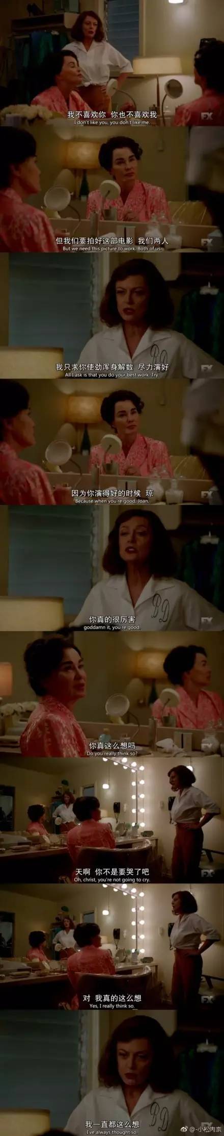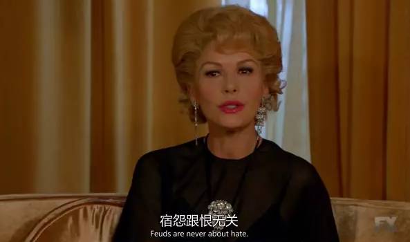 她说的是——“宿怨跟恨无关,宿怨是源于痛苦。”(“Feuds are never about hate. Feuds are about pain.”)没错,之所以这一场被搬上电视荧屏的撕X大戏这样的精彩这样跌宕,就是因为,它们直指人生痛苦的根源。