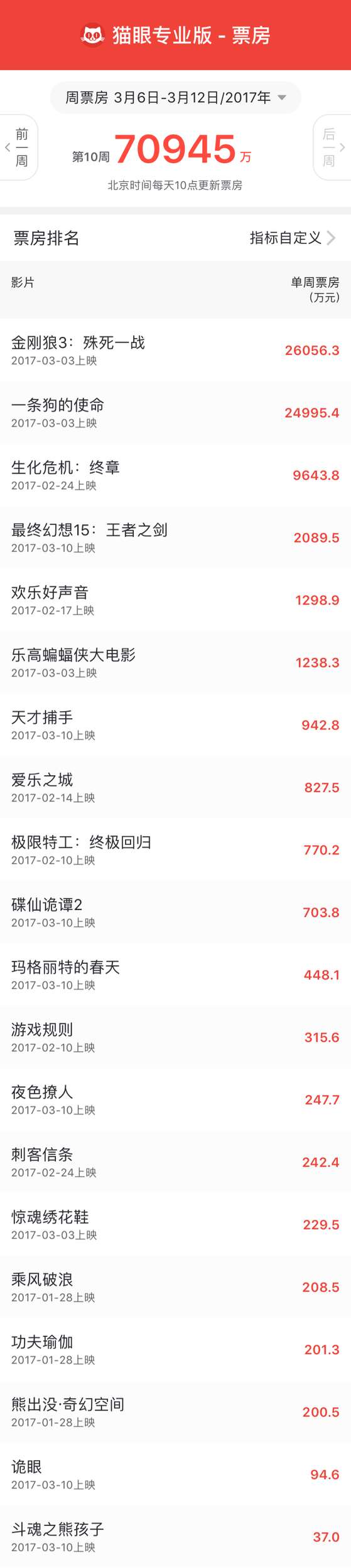猫眼专业版讯:根据猫眼专业版实时票房统计,2017年的第10周(3月6日-3月12日),截止到发稿时,在多部进口老片《一条狗的使命》、《金刚狼3:殊死一战》、《生化危机:终章》等的带领下,周总票房累计报收7.09亿元,放映总场次为173.6万场,周观影人次为2238万,平均票价为31.7元。