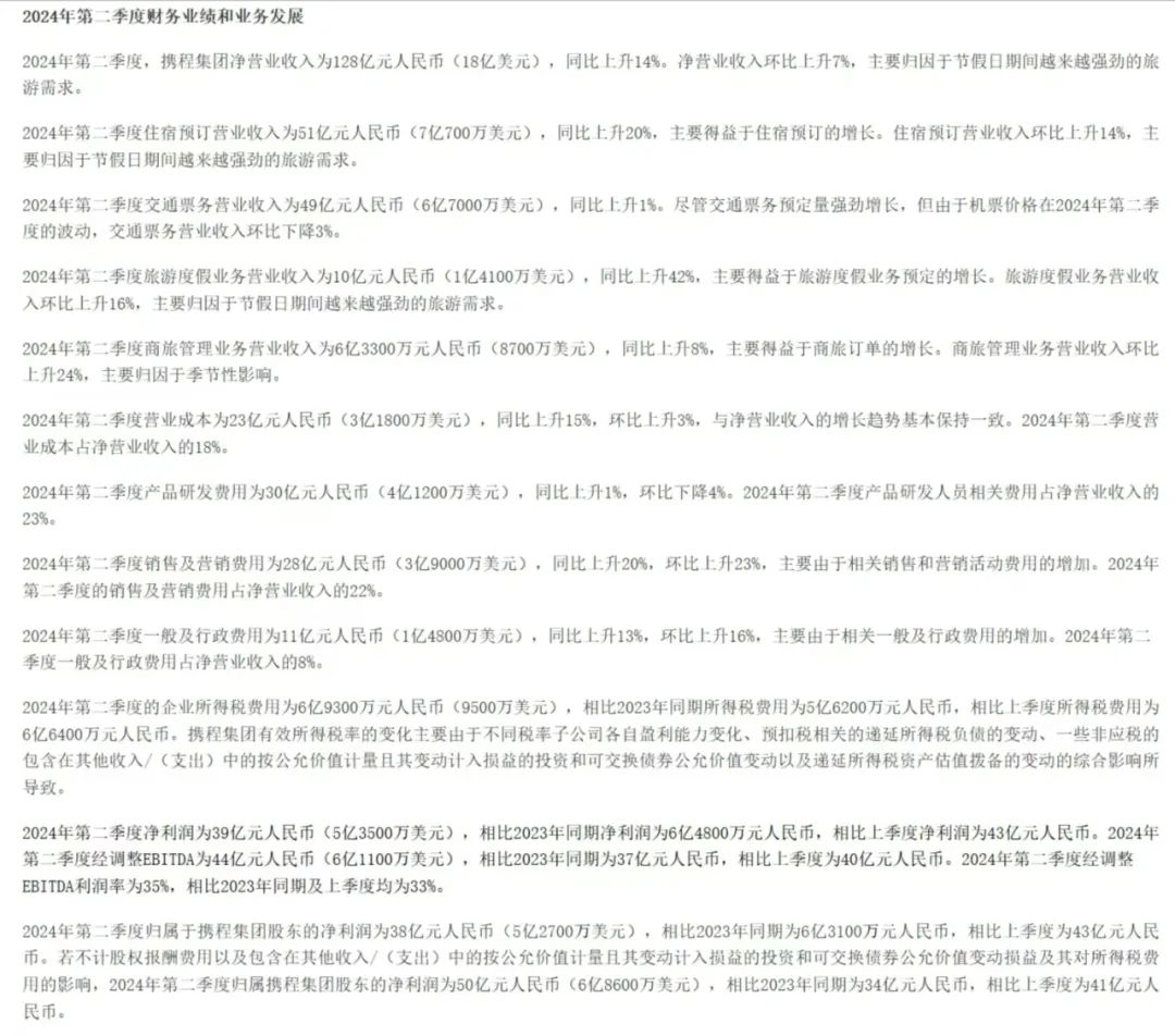 ①二季度住宿预订营收为51亿元,同比上升20%,环比上升14%。交通票务营收为49亿元,同比上升1%。