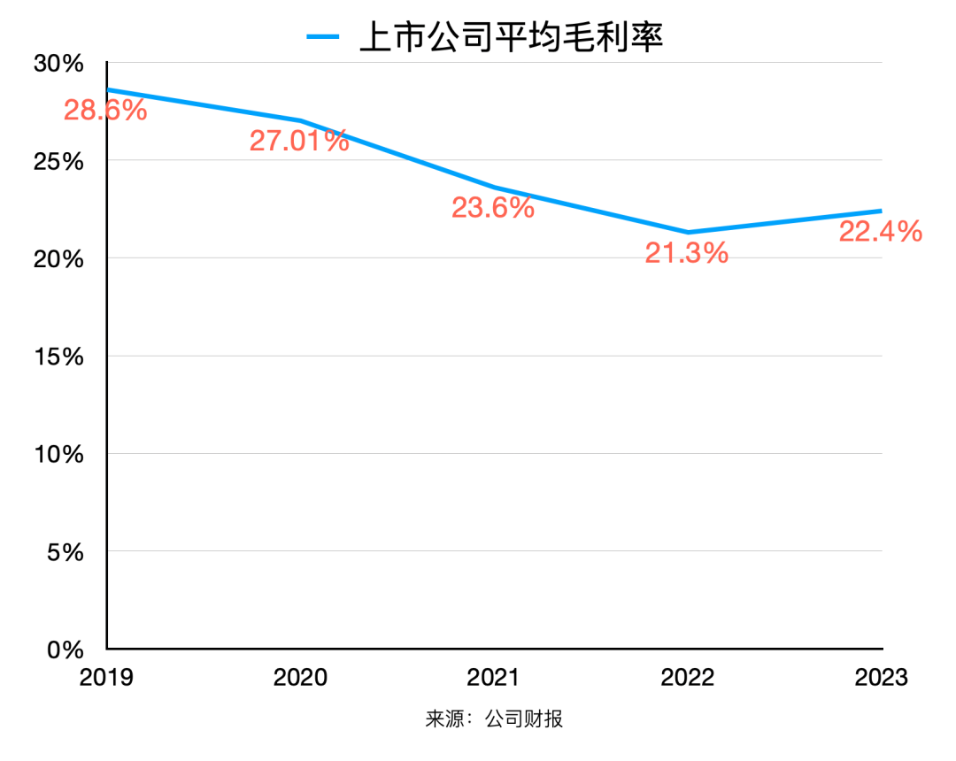 梳理过去五年的财报数据,用更宏观的视角来看,下滑趋势则更为清晰:2019—2023,十家上市公司的的毛利率平均值一路下跌,仅2023年小幅回升,从2019年平均28.6%的毛利率,到去年的22.4%,同比降幅22%。