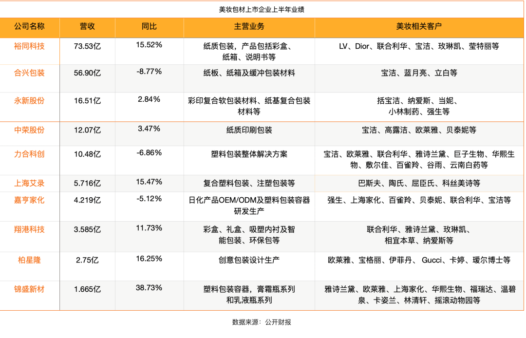 第一梯队裕同科技和合兴包装上半年营收均超过50亿元,分别为73.5亿元和56.91亿元。其中裕同科技虽然体量巨大,但增长表现依然亮眼。除了稳固消费电子、烟酒行业业务的基本盘外,裕同科技积极拓展化妆品业务的努力也是增长迅速的助力之一,包括LV、Dior、联合利华等美妆日化行业知名品牌均是其客户。