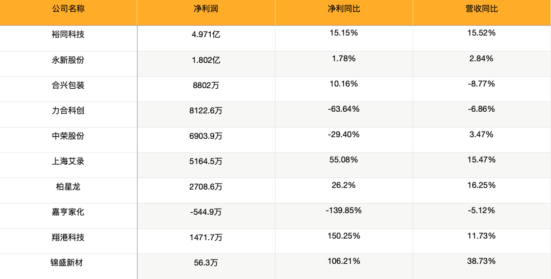 裕同科技、合兴包装和上海艾录的净利润同比分别为15.15%、10.16%和55.08%,考虑到其销售体量和净利润规模,双位数的同比增长成色不俗。