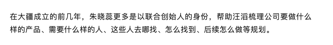 我不确定朱晓蕊在她之后孵化的、和目前担任职务的企业中扮演了什么角色。在《中国企业家》这篇采访中,朱晓蕊将自己在大疆的工作叙述为创业导师一样的角色。但如前面亲历过大疆初创过程的前员工说的,现在流传的大疆创业故事里“含师量”有点重。据我所知,大疆初创的过程非常艰难,是一步步摸索过来的,这个过程没法依靠所谓的“教”和“导”。