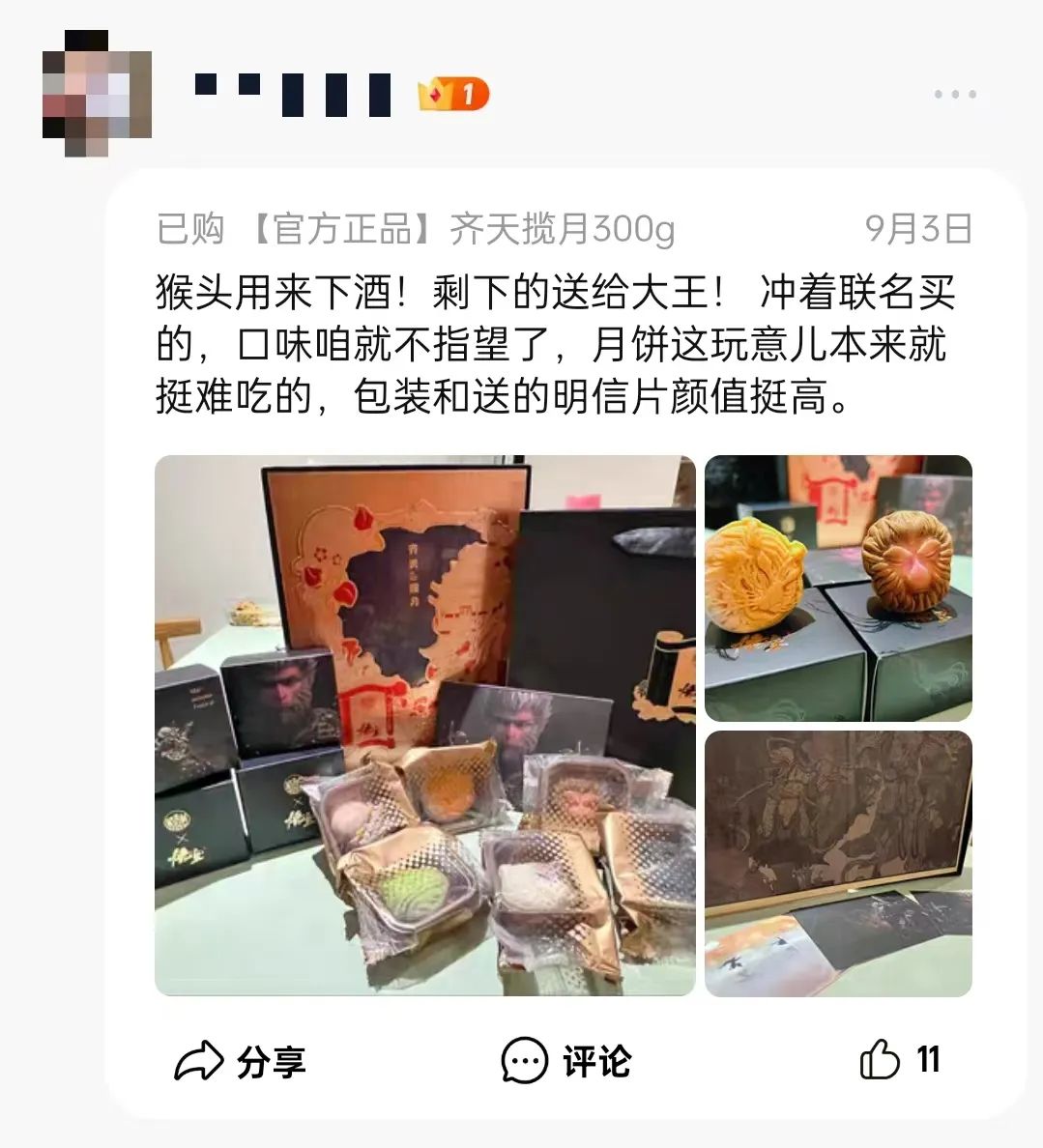 从制作宣传上,足以见得稻香村对本次联名活动的重视程度,而游戏玩家经历过瑞幸事件之后,似乎也对跨界营销接受良好。在联名礼盒的评论区,胖鲸注意到,大部分消费者普遍都对产品包装认可,但有不少针对月饼口味的差评。有消费者就表示,本就对月饼的口味不抱希望。毕竟大家都是冲着联名买的,属于现代版的“买椟还珠”,月饼大概起到一个造型上的作用吧。