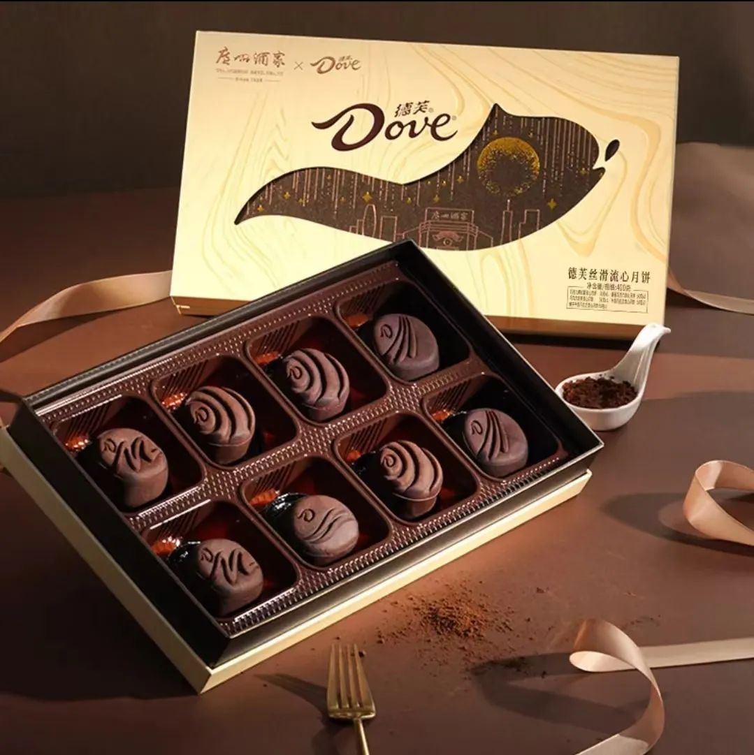 广州酒家与德芙联名推出了巧克力流心月饼礼盒,一盒八个,有黑松露、酱香、榛子牛奶等不同的巧克力风味;此外,广州酒家还与 M 豆进行了联名同样推出月饼礼盒,将月饼外型做成了类 M 豆,但风味仍然与德芙一致。值得注意的是,这两个品牌都为玛氏旗下所有。