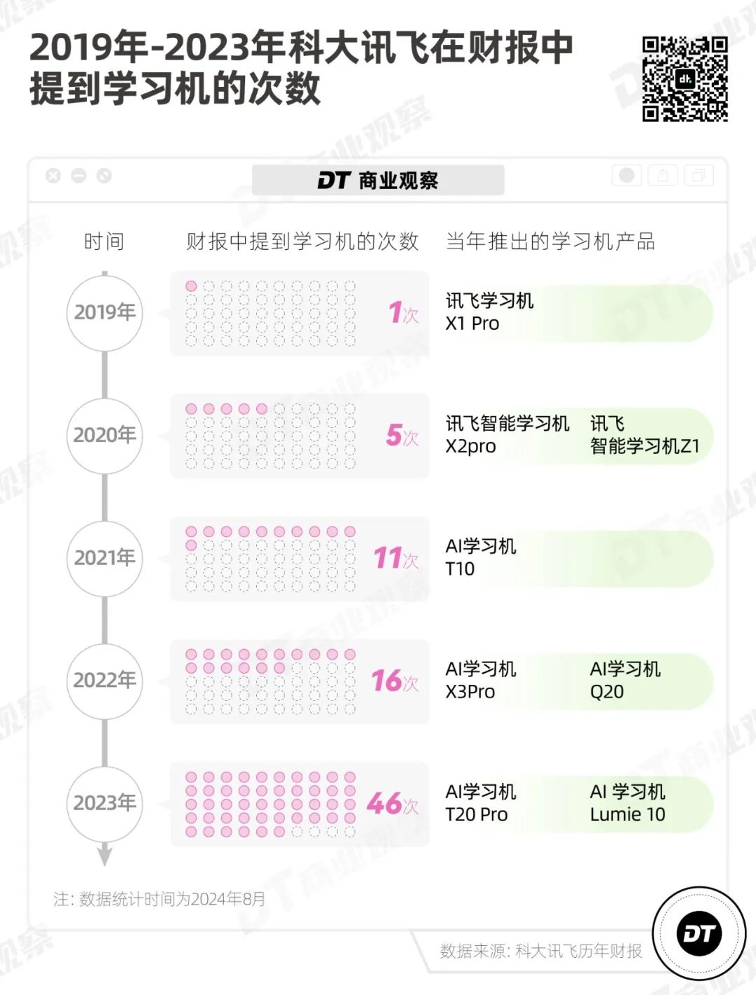 另一个可以侧面论证的数据是,从2019年到2023年,在科大讯飞的年度财报中,学习机出现的次数明显增加。