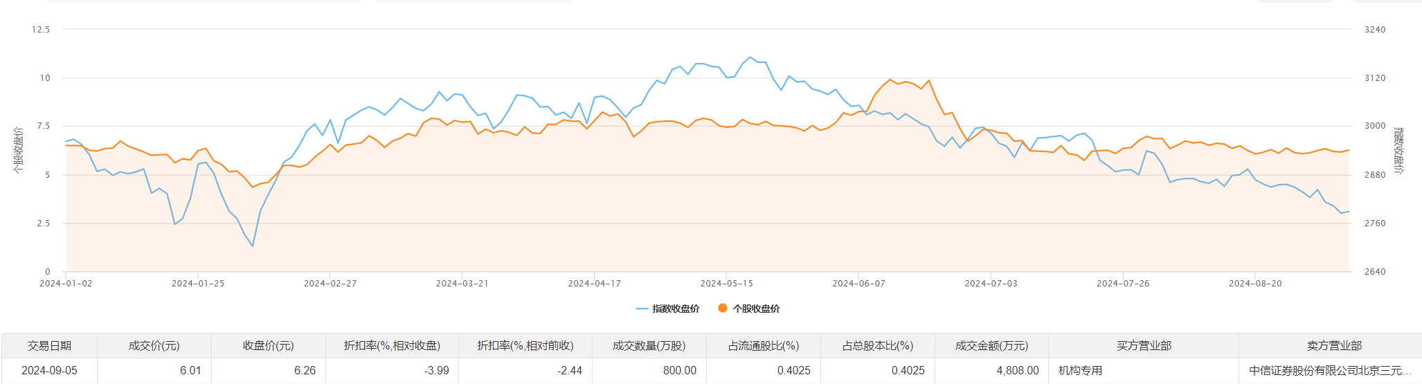 万通发展9月5日大宗交易成交800万股,成交额4808万元,占当日总成交额的29.13%,成交价6.01元,较市场收盘价6.26元折价3.99%。