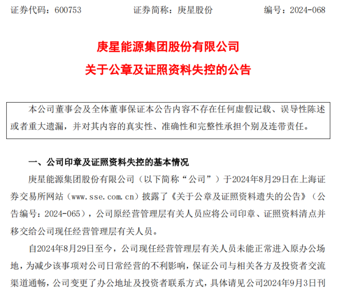 8月29日,庚星股份公告称,公司有关人员称公司印章、证照资料已遗失,未能办理有关移交手续。