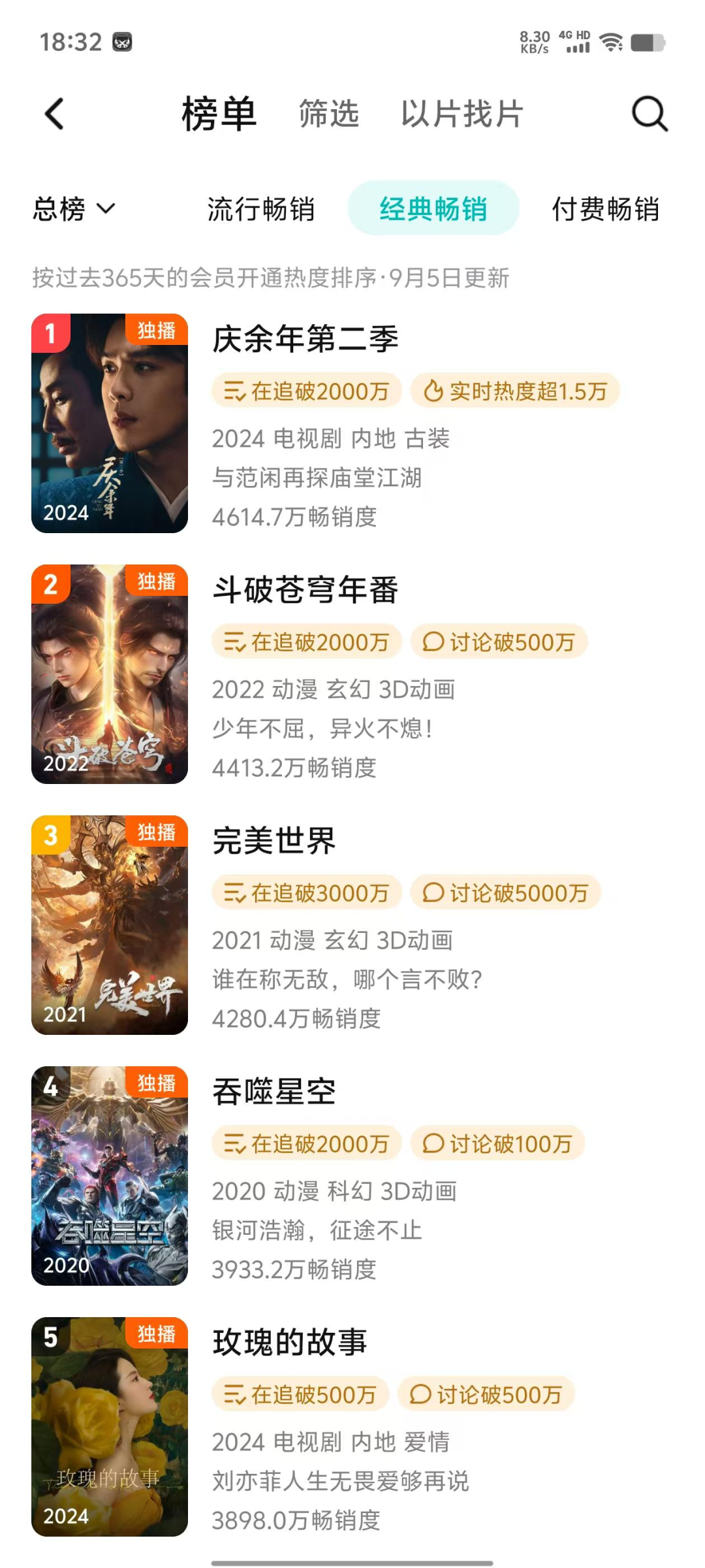 小娱再用腾讯视频的官方【经典畅销榜(即365天内会员开通热度排序)】举例,前四名为男性向明显的项目,甚至是动漫类圈层明显的项目,当然坏处就是男性网络社交能力和意愿偏弱,难以产生破圈影响力。