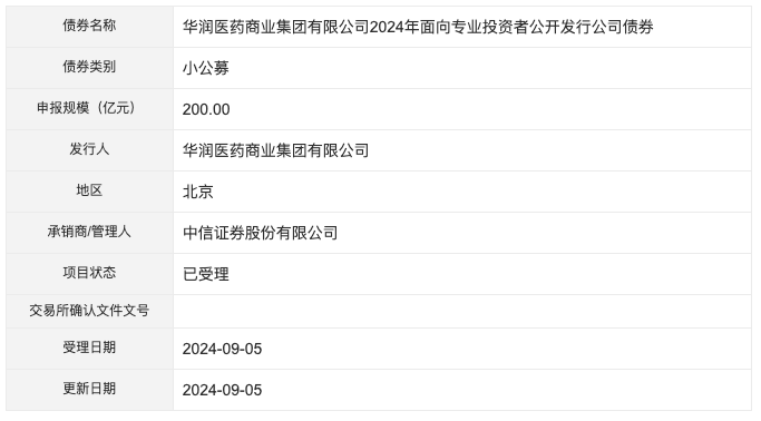 深交所项目进度信息显示,华润医药商业集团有限公司200亿元小公募债项目状态更新为“已受理”,受理日期为2024年9月5日。
