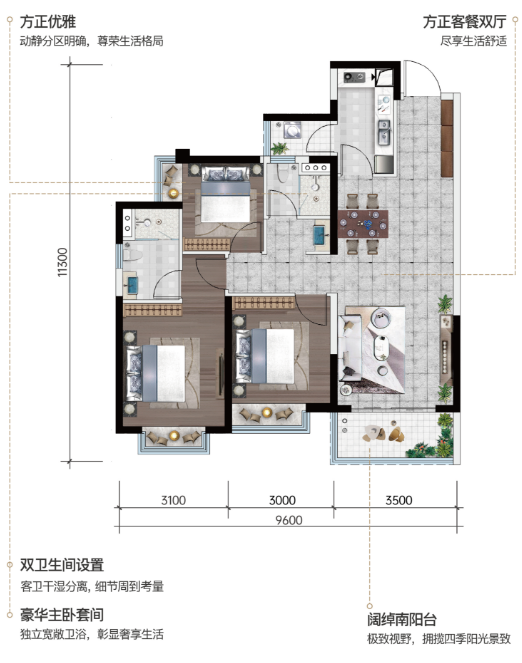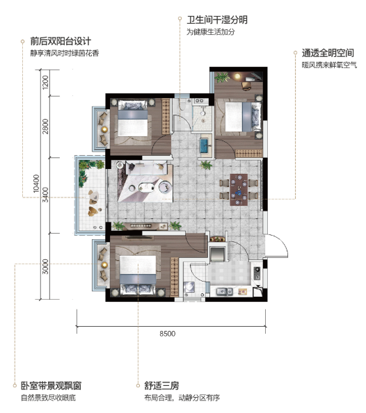 全能的三房格局,足够容纳下多种场景演绎。不论是宽绰的二人世界,还是温馨舒适的三口之家,亦或是其乐融融的三代同堂,都能轻松拿下。