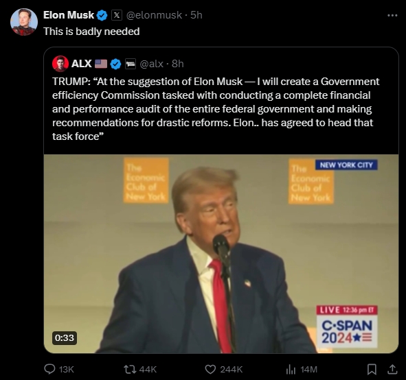 美国共和党总统候选人、前总统特朗普9月5日在纽约经济俱乐部阐述其经济计划时宣布,将按照马斯克的建议成立一个“政府效率委员会”,任务是“对整个联邦政府进行全面的财务和绩效审计,并提出建议进行大刀阔斧的改革”。