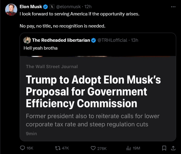 马斯克在社交媒体上回应特朗普演说时表示,美国“太需要这个委员会了”。他写道,“如果有机会,我期待为美国服务。不需要报酬,不需要头衔,不需要认可。”