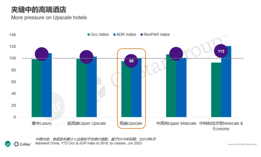 时间线再拉长,2023年上半年,高端酒店的RevPAR只有2019年同期的95%,是唯一一个未能恢复至2019年同期表现的酒店级别。