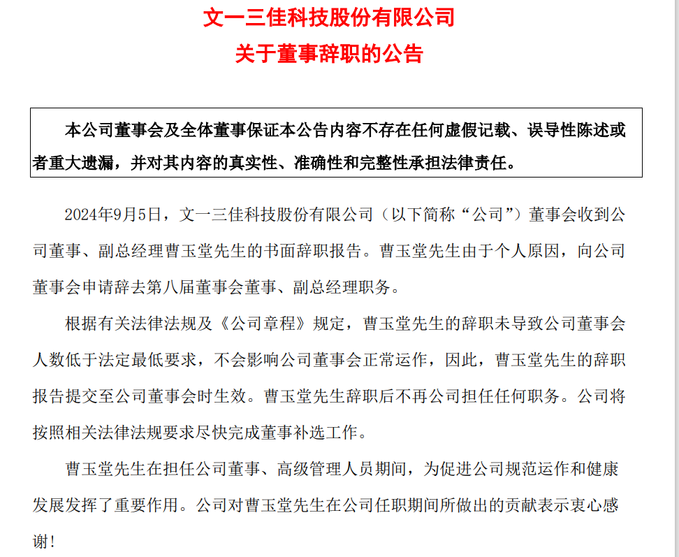 据文一科技公告消息,2024年9月5日,文一科技董事会收到公司董事、副总经理曹玉堂先生的书面辞职报告。曹玉堂先生由于个人原因,向公司董事会申请辞去第八届董事会董事、副总经理职务。 根据有关法律法规及《公司章程》规定,曹玉堂先生的辞职未导致公司董事会 人数低于法定最低要求,不会影响公司董事会正常运作,因此,曹玉堂先生的辞职 报告提交至公司董事会时生效。曹玉堂先生辞职后不再公司担任任何职务。