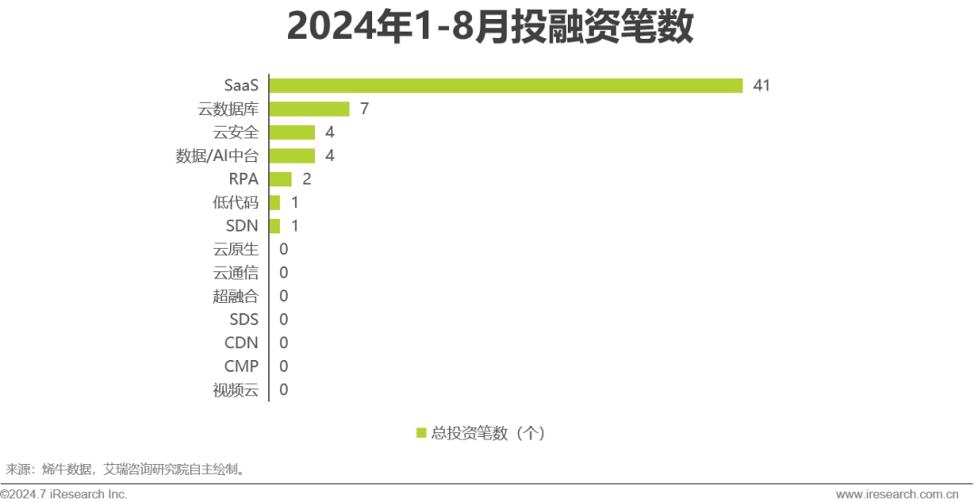 艾瑞观点:8月SaaS赛道投融资累计41笔,新增5笔,仍是笔数最高的赛道。此外云数据库新增1笔,其余赛道暂无融资动态发生。