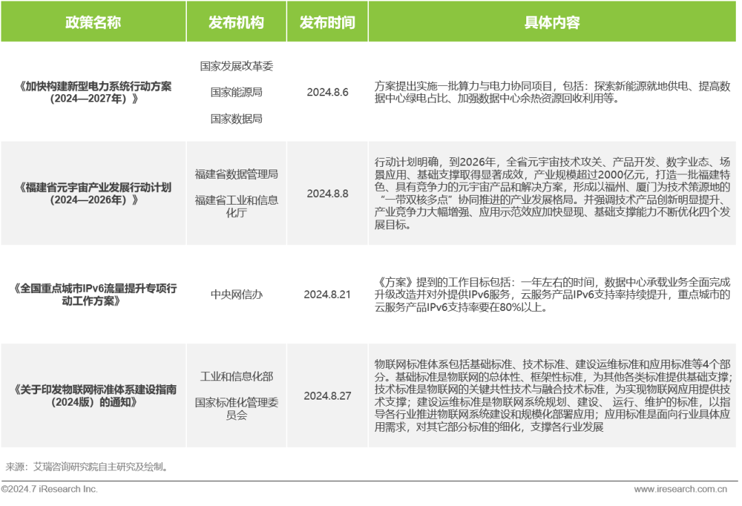 本报告长期监测数据中心、基础云、SaaS、行业云等赛道动态,基于对2024年8月各行业的观察,得出以下观点: