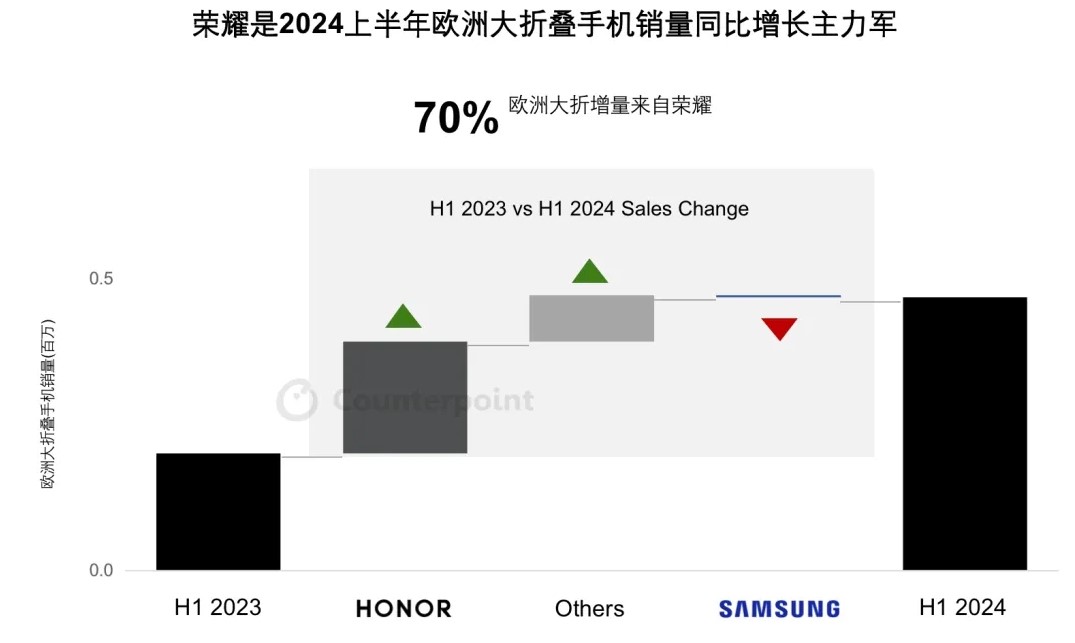 Counterpoint近期发布的两份最新报告显示,2024年第二季度,荣耀首次超越此前几乎在欧洲折叠屏市场占据垄断地位的三星,拿下西欧大折叠屏市场份额第一,并且2024整个上半年较2023 年上半年,大折叠手机欧洲市场销量翻了一倍,其中70%的销量增长都来自荣耀。报告还指出,2024年第二季度,荣耀在全球市场折叠屏手机出货量同比增长455%,成为增幅最大的手机品牌。
