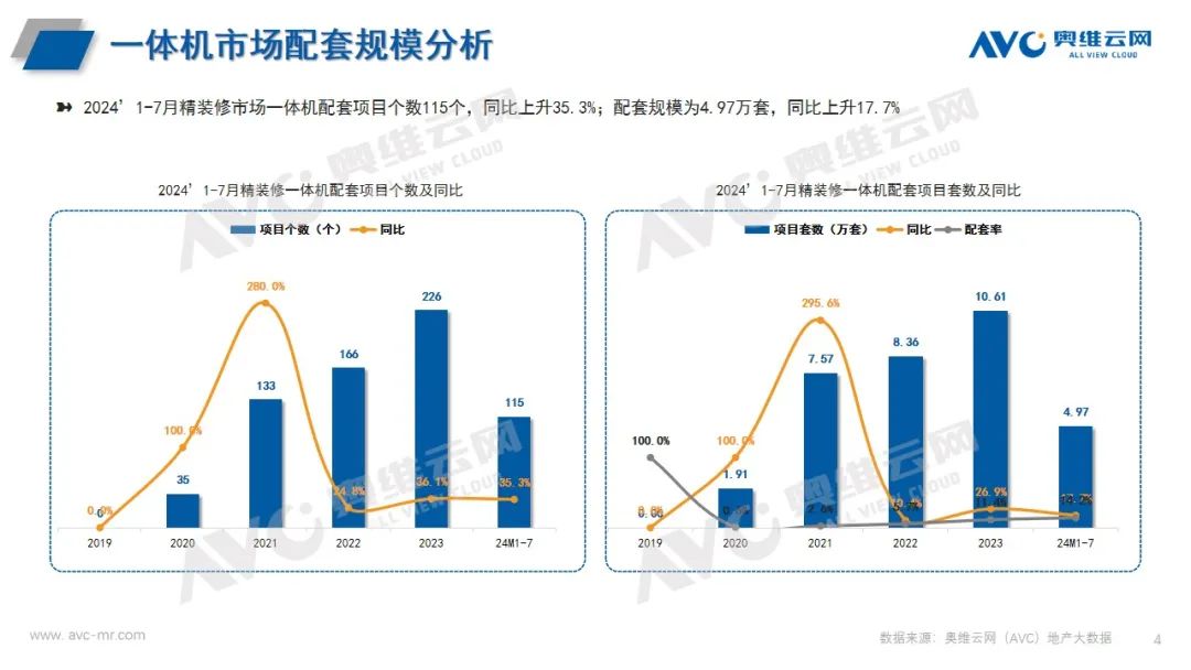 洗碗机、一体机规模及配置率逆势增长。奥维云网(AVC)监测数据显示,2024年1-7月精装修市场配套烟机项目数590个,规模32.82万套,同比-24.1%,配置率94%;配套洗碗机项目数364个,规模19.09万套,同比+7.8%,配置率54.7%,同比+15.2%;配套一体机项目115个,规模4.97万套,同比+17.7%,配置率14.2%,同比+4.8%。