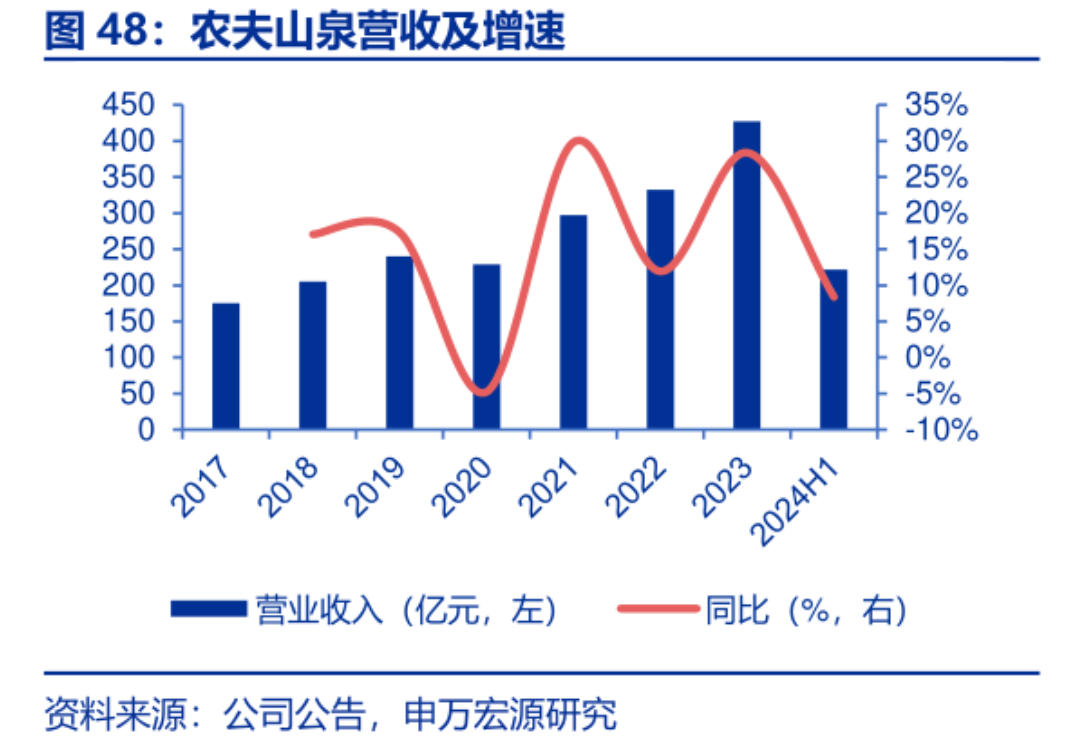 做个简单对比,2021-2023年,该项业务的同比营收增速分别为22.1%、7.1%、10.9%,为农夫山泉贡献的营收比例分别为57.4%、54.9%、47.5%——虽然呈现下滑趋势,但还能维持在50%上下的水平。