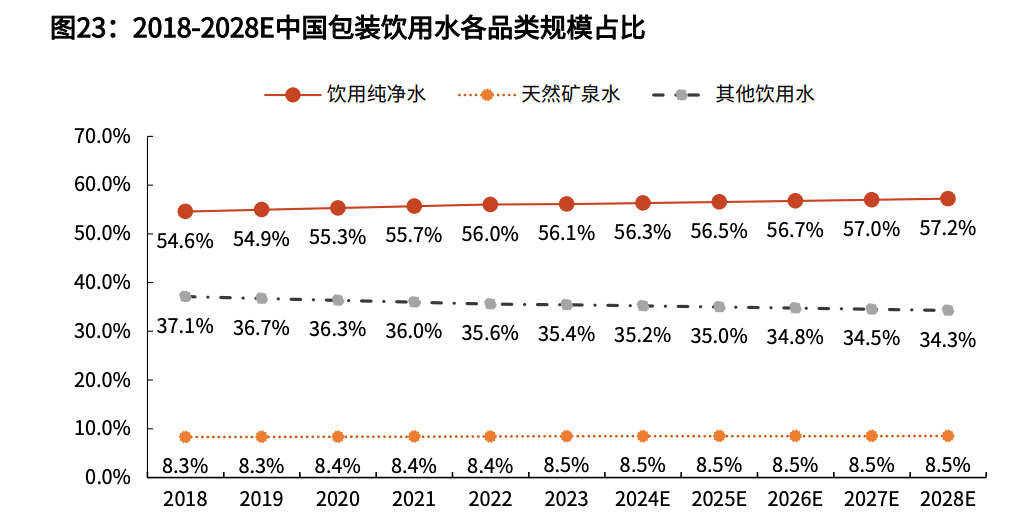 据光大证券,2018-2023年,中国饮用纯净水的市场规模从833亿元增长到了1206亿元,份额占比从54.6%提升到了56.1%,据其预测,2023-2028年,饮用纯净水市场规模将持续扩大,将从1206亿元增长至1798亿元,份额也将提升至57.2%。