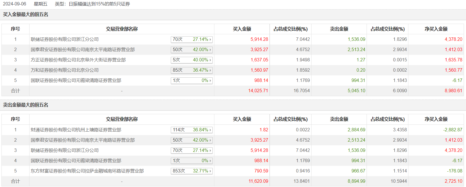 具体来看,知名游资现身龙虎榜,联储证券浙江分公司、作手新一(国泰君安证券南京太平南路证券营业部)分别买入5914.28万元、3925.27万元;财通证券杭州上塘路证券营业部、作手新一(国泰君安证券南京太平南路证券营业部)分别卖出2884.69万元、2513.24万元。