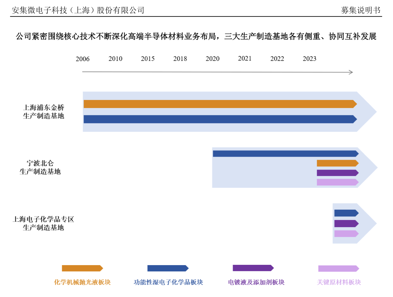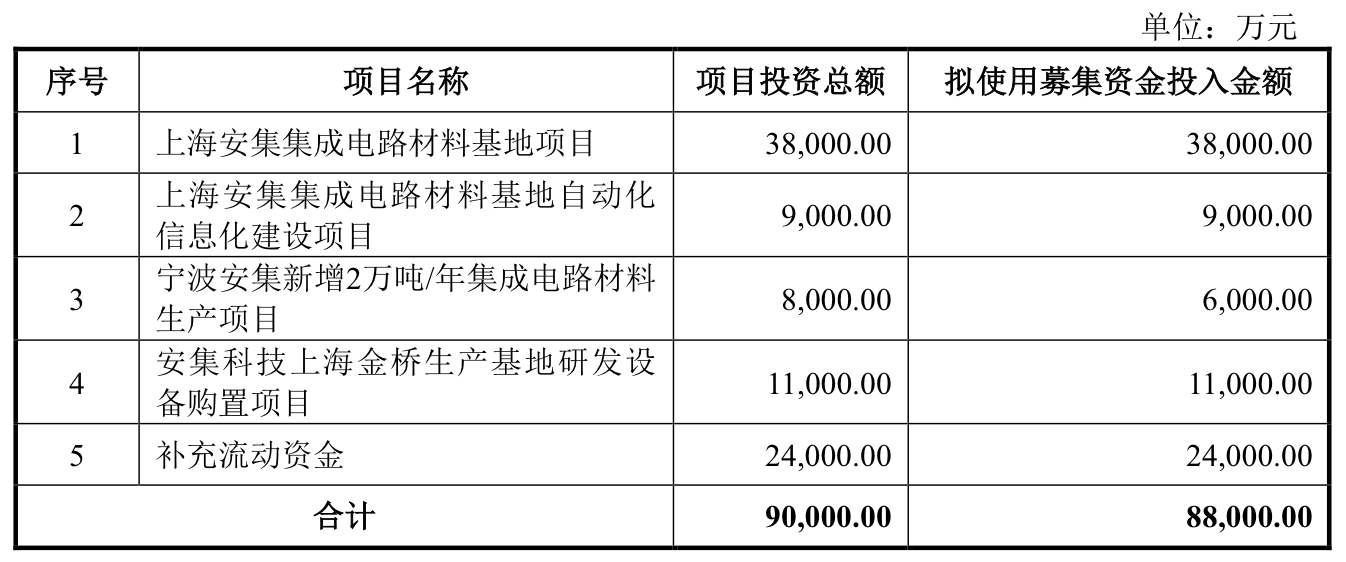 此次安集科技的8.8亿元,将投入5个项目,除了2.4亿元补流外,3.8亿元投入“上海安集集成电路材料基地项目”,9000万元投入“上海安集集成电路材料基地自动化信息化建设项目”,6000万元投入“宁波安集新增2万吨/年集成电路材料生产项目”,1.1亿元投入“安集科技上海金桥生产基地研发设备购置项目”。