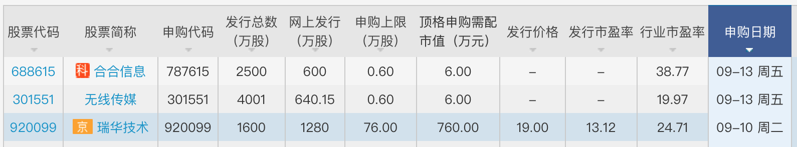 9月13日周五,打新者又可申购无线传媒(301551.SZ)和合合信息(688615.SH)。无线传媒的申购上限为0.6万股,顶格申购需配市值6万元,所处行业市盈率19.97倍;合合信息申购上限同样0.6万股,所处行业市盈率38.77倍。
