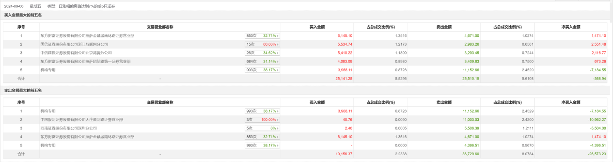 界面新闻发现,随着海思全联接大会日程的逐步逼近,深圳华强龙虎榜买盘中,游资的身影正在逐渐淡去,取而代之的是散户的大批涌入。根据深圳华强9月6日龙虎榜数据,“散户大本营”东方财富证券股份有限公司拉萨金融城南环路证券营业部以及东方财富证券股份有限公司拉萨团结路第一证券营业部分别处于买一和买四的位置,分别净买入1474.1万元以及673.26万元。两家机构分别出现在卖一和卖五席位,分别净卖出7184.55万元及4396.51万元。值得注意的是,知名游资陈小群所在的中国银河证券股份有限公司大连黄河路证券营业部买入40.76万元并卖出1.1亿元。