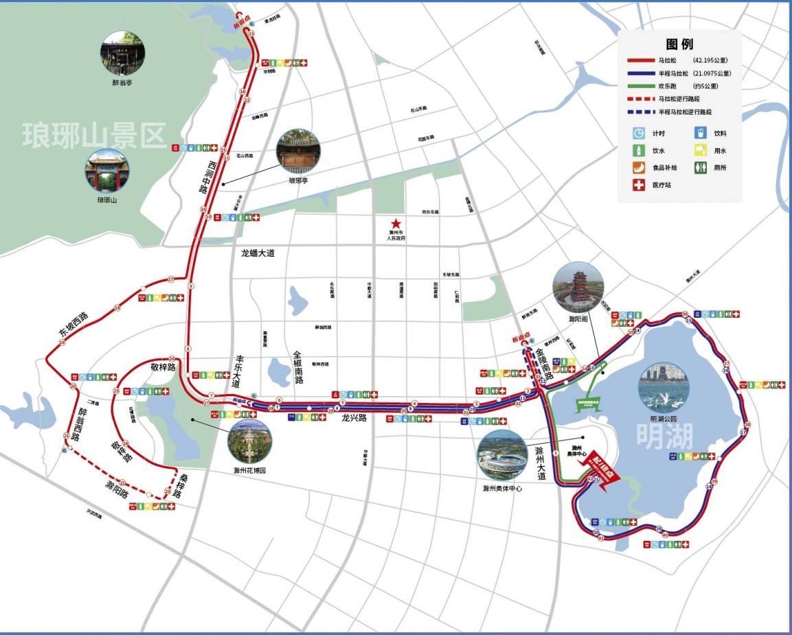 路线:滁州奥体中心(起点)→环湖路→恒兴路→滁州大道→丰乐大道(折返)→龙兴路→金陵南路→敬梓西路(折返)→金陵南路→滁州大道→环湖路→滁州奥体中心(终点)。