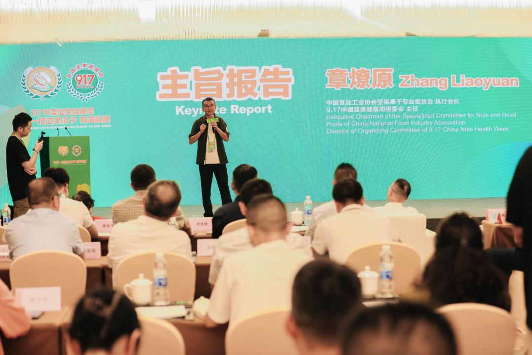 开幕式上,中国食品工业协会坚果炒货专业委员会执行会长、9.17中国坚果健康周组委会主任、三只松鼠创始人兼CEO章燎原作主旨报告,他认为中国坚果大有可为,呼吁行业致力于让坚果回归坚果。