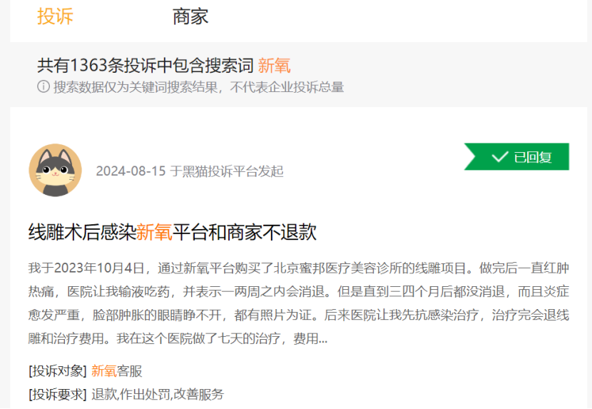 黑猫投诉平台显示,有关新氧的投诉达1363条,涉及虚假宣传、卫生不合格、操作不当导致过敏、资质不合规等问题。