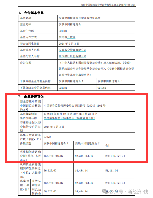 作为我国第九家外商独资基金管理公司,安联基金旗下首只主动权益产品发行并没有想像中大卖。2024年9月4日,安联中国精选发布基金合同生效公告称,基金于9月3日正式成立,首次募集规模2.5亿元,募集有效认购总户数2072户,户均认购金额约12.07万元。