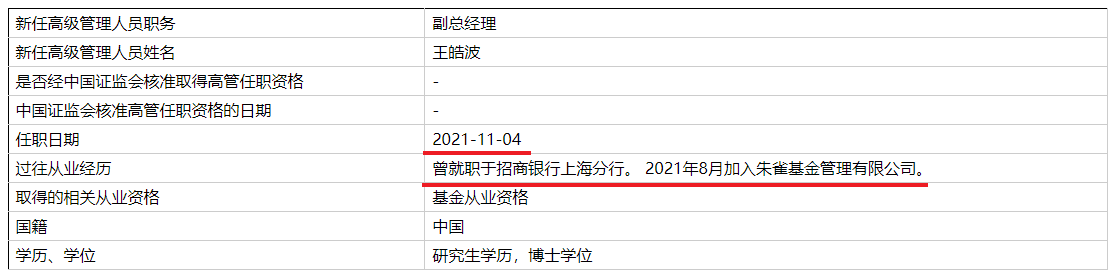 他曾在招商银行任职,2021年8月加入朱雀基金,11月就升任副总经理一职。