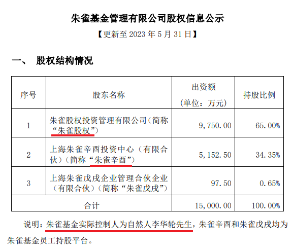 朱雀基金是一家从私募向公募转型的基金公司,其股东主要是朱雀股权和朱雀辛酉,持股比例分别为65%、34%,实际控制人是李华轮。