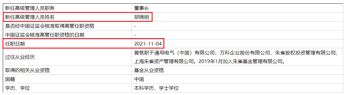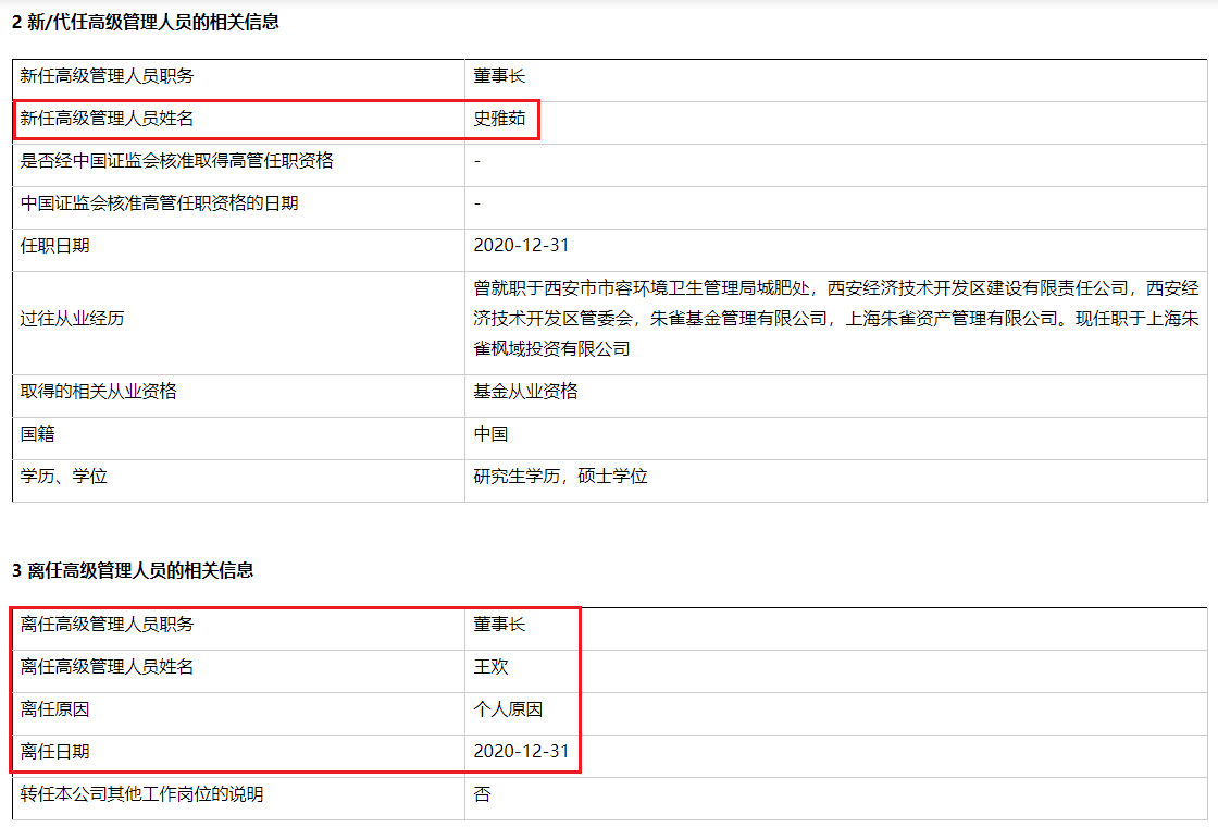 不仅是副总经理,就连朱雀基金的董事长一职,近几年更换也相当频繁。