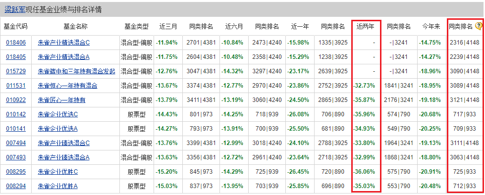 以掌舵人梁跃军管理的基金为例,近两年可比收益均亏损32%以上,同类排名明显落后。