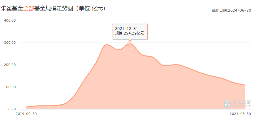 作为一家由私募转型而来的基金公司,朱雀基金的巅峰出现在2021年底。彼时,其管理规模从2020年6月底的不足20亿元,迅速扩张至294亿元。