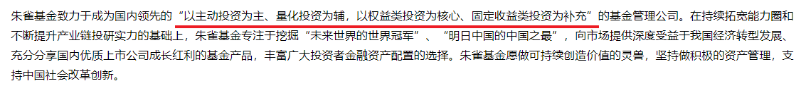 值得注意的是,与大多数中小基金公司不同,朱雀基金明确提出“以主动投资为主、以权益类投资为核心”。