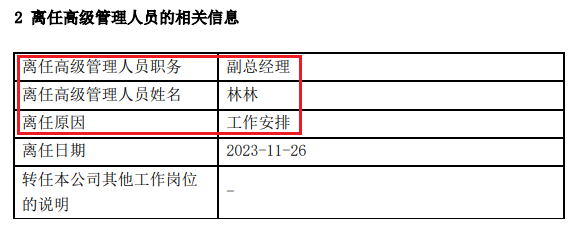随后在2023年11月26日,林林又因“工作安排”不再担任公司副总经理一职。