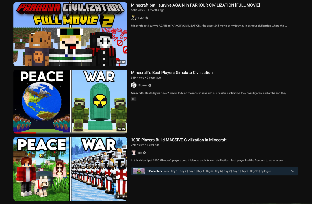 在「数字孪生」与「数字生命」这两个概念爆火之前,《我的世界》其实一直是关于文明发展过程的优秀载体,由此带来的意义甚至已经超过了游戏本身的内容。让两组「村民」(游戏中的 NPC)在玩家的干涉下,各自发展文明,在发展到一定阶段后爆发战争,经常是 YouTube 上《我的世界》主题视频中的热门视频,播放量以千万计。